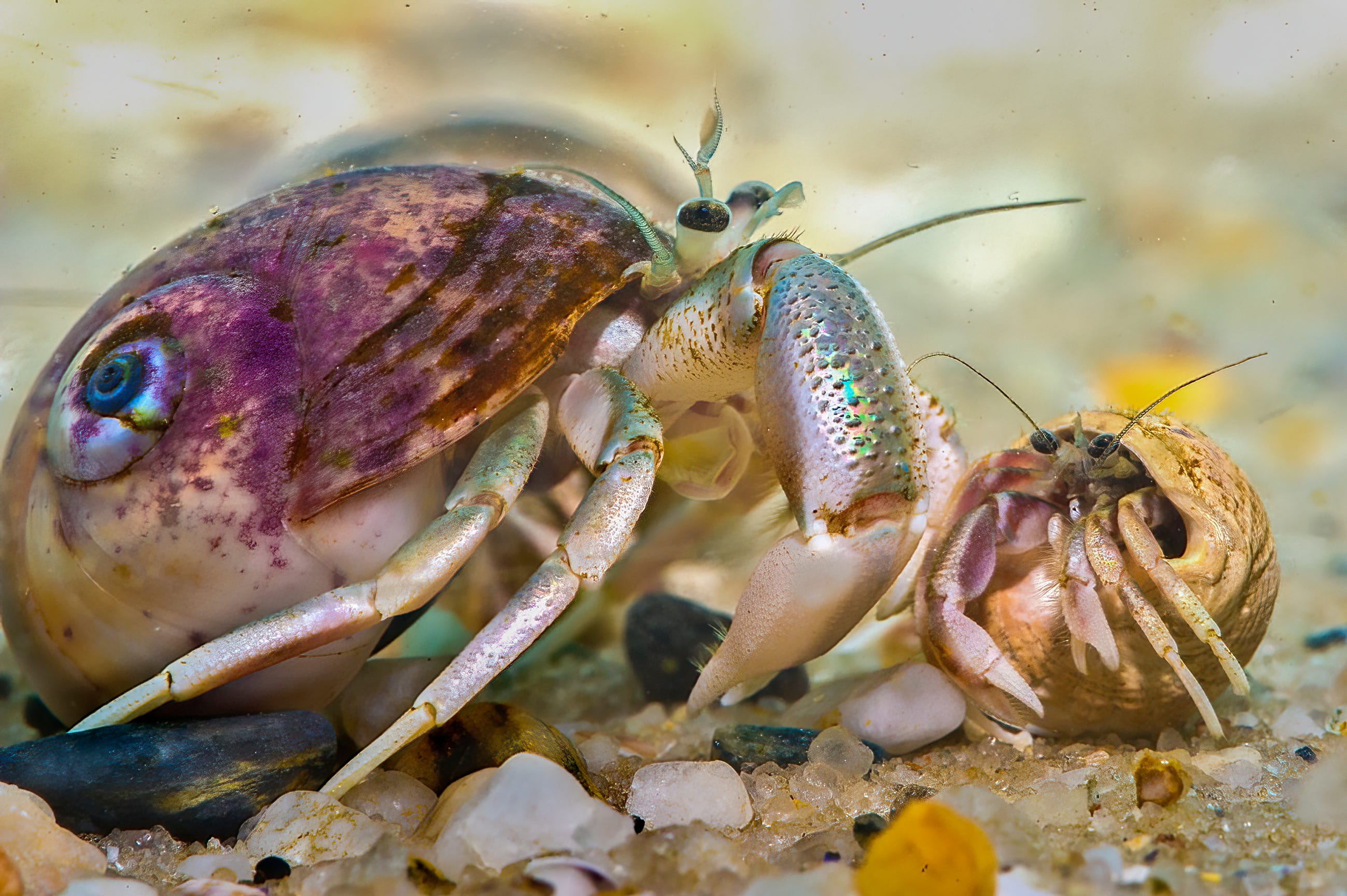 Occupying an empty snail shell is a matter of life and death to hermit crabs. A crab deprived of a shell becomes a tasty bite to many predators like fish, hard-shelled crabs, and octopuses. Becoming, in my terminology, a rich crab, supplies many benefits beyond just survival. Crabs in bigger shells can develop larger body sizes, and larger sizes convey advantages. Larger males are more successful in mating than smaller ones, and bigger females produce more eggs than smaller ones.