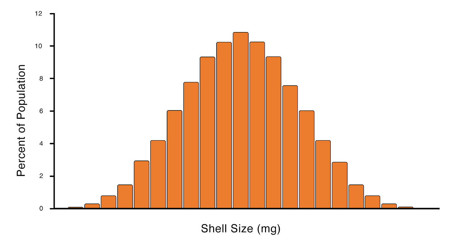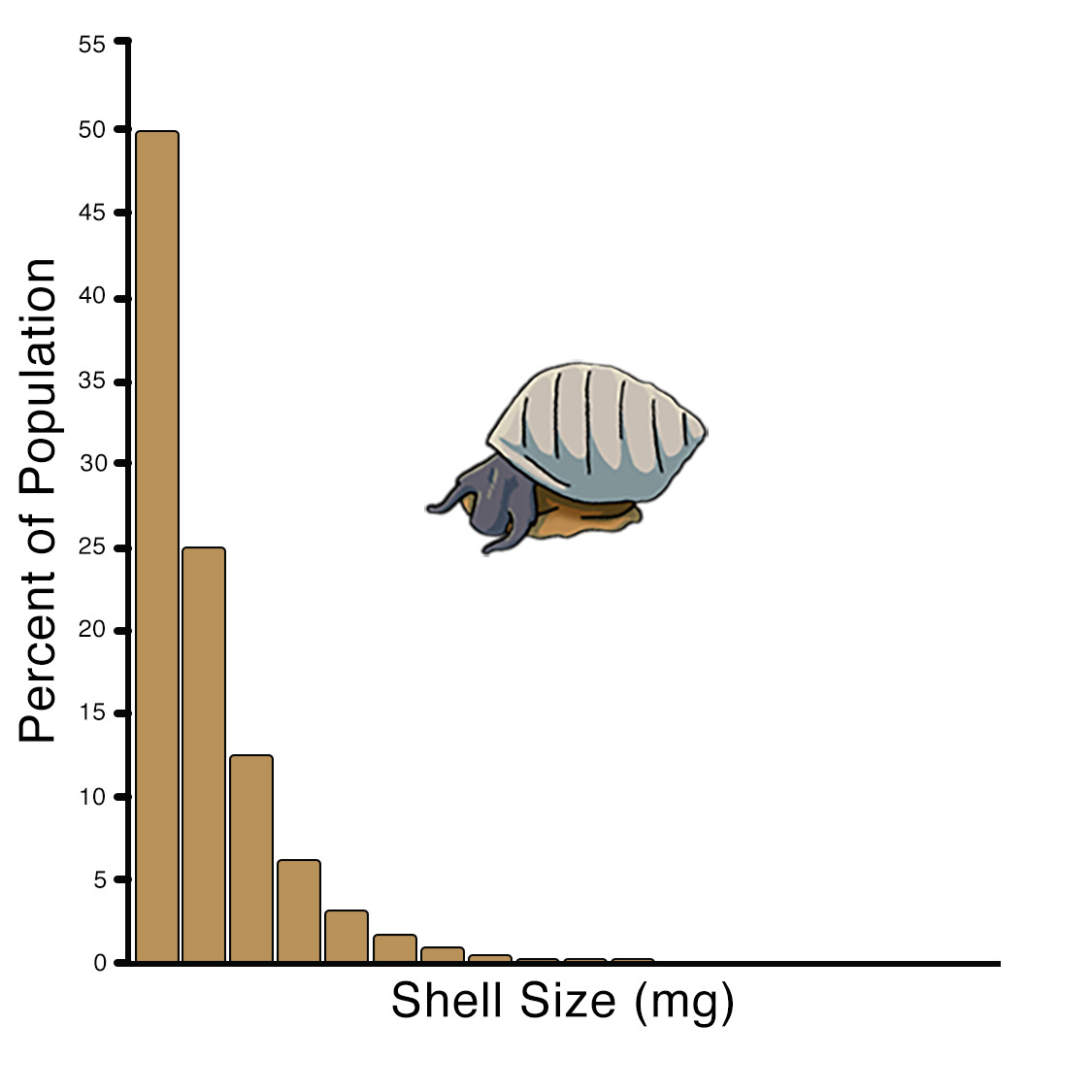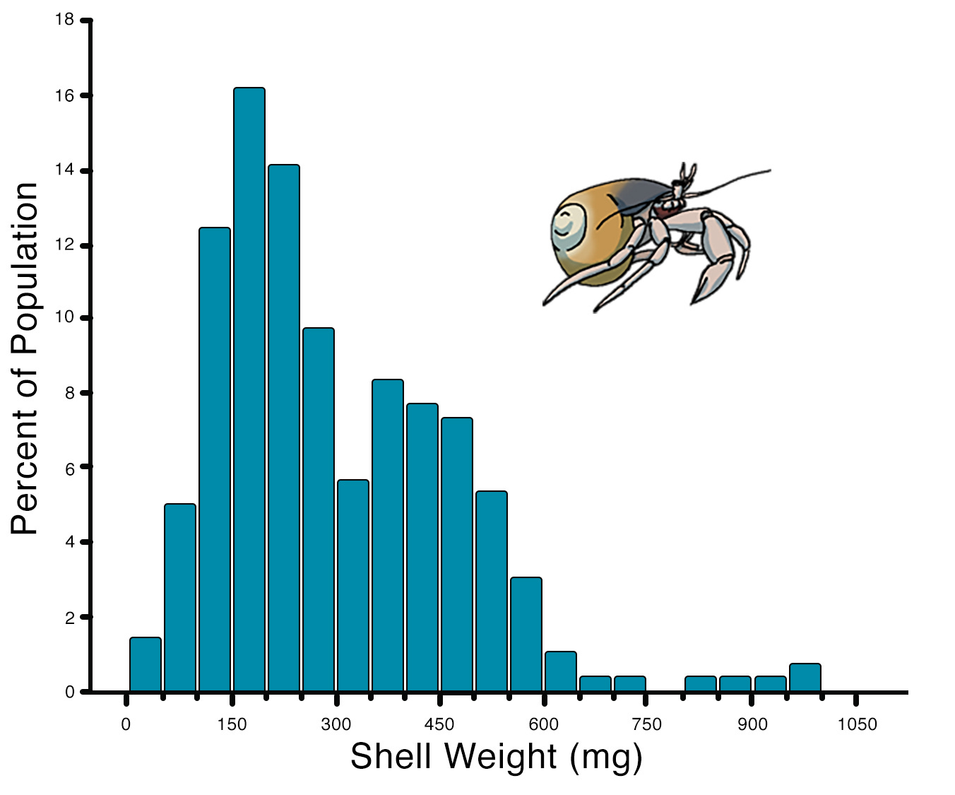 Before we graphed the shell weights, we didn’t know what the distribution would look like. We thought of several possibilities. Maybe the graph would resemble a typical distribution of shell sizes from a species of snails, like those that hermit crabs might use, or the sizes of regular, hard-shelled crabs (top figure, below). In snails and hard-shelled crabs, most individuals die young at relatively small sizes, so the bars of the graph diminish very quickly as the sizes of the crabs or snails get larger. Another possibility would be a typical bell-shaped (normal or Gaussian) distribution with many shells of average sizes but very few of very small or very large sizes (middle figure, below). Or – we weren’t counting on this one – it would look like a typical graph for the distribution of wealth in human societies (bottom figure, below). Graphs for human wealth across different societies typically have certain, characteristic features: they have a single mode or peak, are skewed to the right, and have a fat right tail, also to the right.